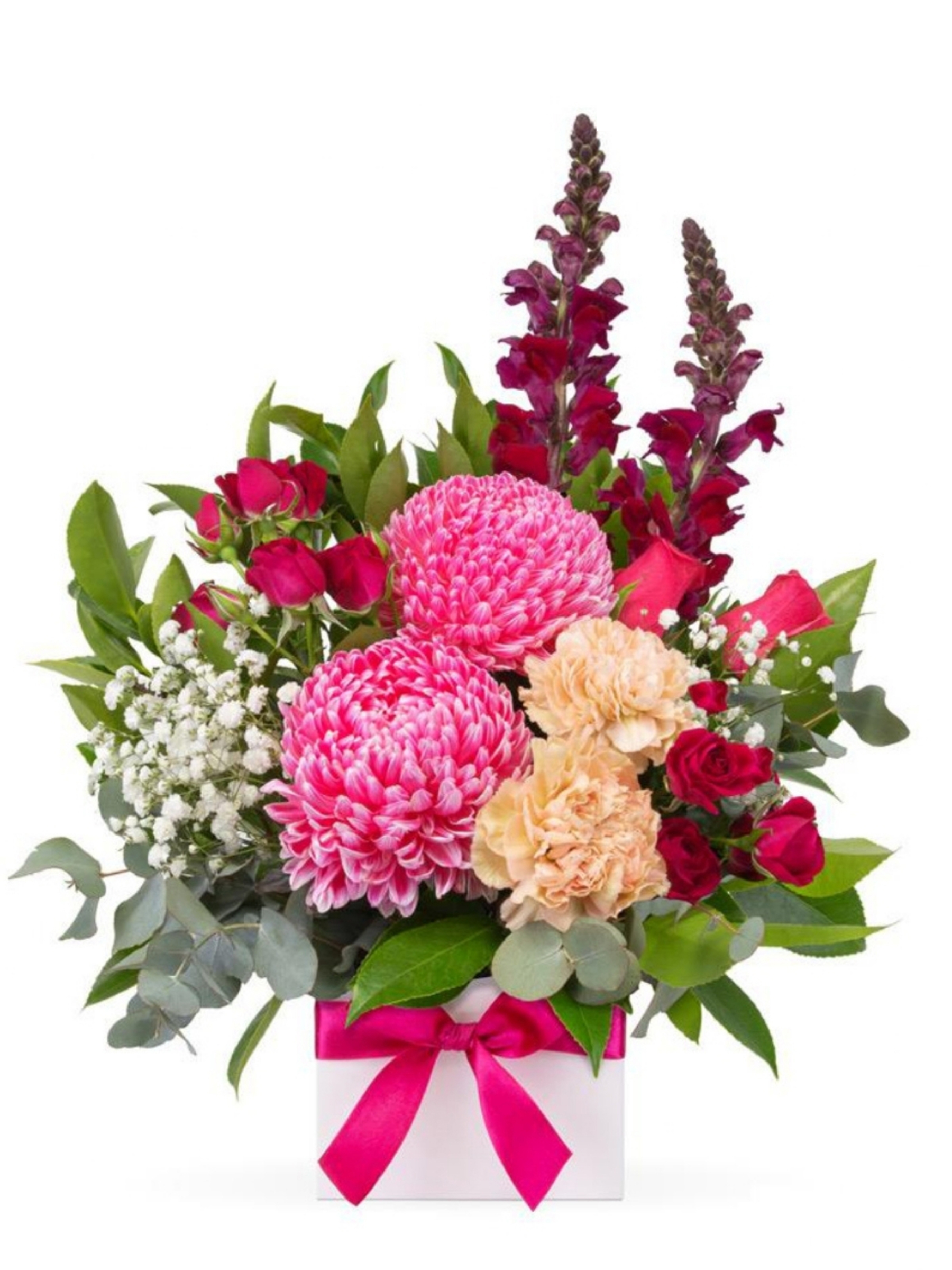 A delightful arrangement combining soft and bright tones! Featuring large Fuschia Pink Chrysanthemums, delicate Peach Carnations, and towering Burgundy Snapdragons. Presented in a stylish white cube box with a matching ribbon. Perfect for a hospitality gift or brightening someone’s day.